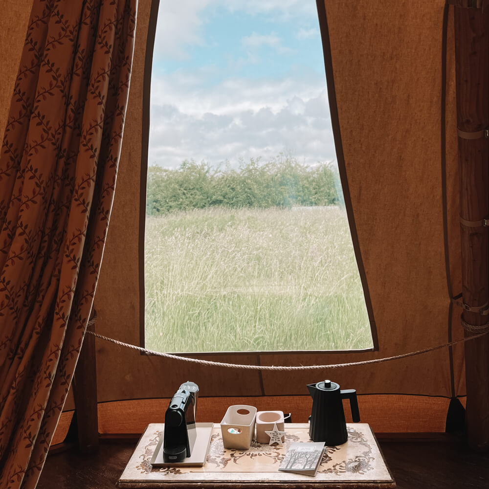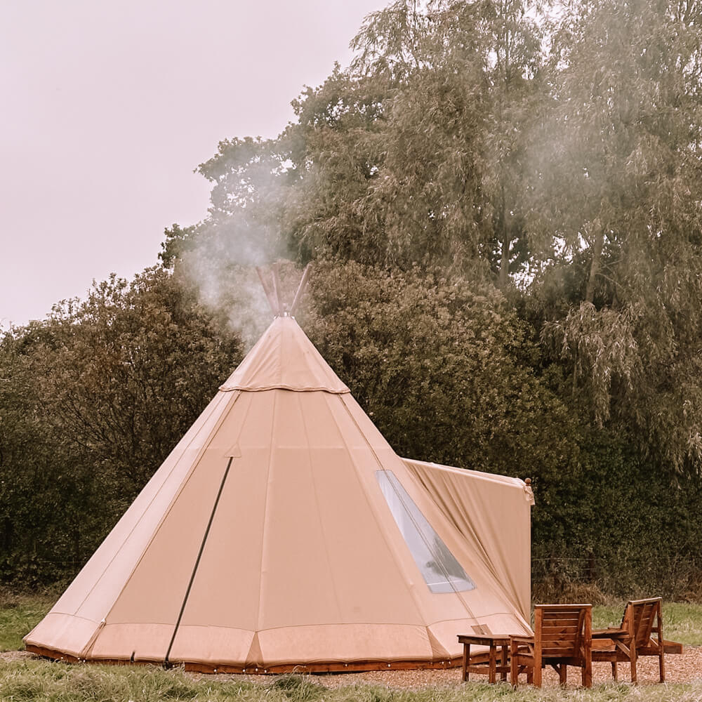 This tipi is French themed with a white painted French vintage 1950s king size bed and matching bedside tables, two Parisian 1930s pink velvet tub chairs and a 1920s Chinoiserie lacquered floral coffee table. Crisp white bed linens, encasing a natural feather and down duvet offset the vintage hand embroidered Suzani throw and pink soft linen-cotton mix retro style cushions. A carved elegant limed wood swan side table adds a touch of Parisian elegance. For warmth there is a glass fronted log burner and soft neutral Nordic rugs and throws. Indulgent luxury white robes and fluffy cotton towels are provided.